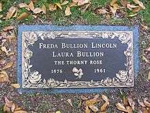 When Bullion turned up in Memphis in 1918, she used the names "Freda Lincoln", "Freda Bullion Lincoln" and "Mrs. Maurice Lincoln", claiming to be a war widow and her late husband had been Maurice Lincoln.[6] She also made herself ten years younger, claiming to have been born in 1887.[1] On her grave marker at the Memorial Park Cemetery in Memphis, Bullion's name is inscribed as "Freda Bullion Lincoln" and "Laura Bullion", her birth name. The epitaph, "The Thorny Rose" refers to her nickname in the Wild Bunch.