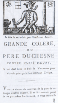 From 1790 to 1791, Père Duchesne represented the constitutional faction, and eulogized King Louis XVI and the Marquis de La Fayette, blaming, on the one hand, Marie Antoinette and, on the other, Jean-Paul Marat, and saving his fire for Jean-Sifrein Maury, the great defender of papal authority against the Civil Constitution of the Clergy. In 1792, the government printed certain issues of Père Duchesne at the expense of the Republic, in order to distribute them to the army to rouse soldiers from a torpor considered dangerous to public safety.
