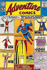 Although intended as a one-off story focusing on Superboy, the Legion proved so popular that it returned for an encore in Adventure Comics #267 (December 1959). In this story, Lightning Boy had been renamed Lightning Lad, and their costumes were very close to those they wore throughout the Silver Age of Comic Books. The Legion's popularity grew, and they appeared in further stories in Adventure Comics, Action Comics, and other titles edited by Mort Weisinger over the next few years.[2] The ranks of the Legion, only hinted at in those first two stories, was filled with new heroes such as Chameleon Boy, Invisible Kid, Colossal Boy, Star Boy, Brainiac 5, Triplicate Girl, Shrinking Violet, Sun Boy, Bouncing Boy, Phantom Girl, and Ultra Boy. Even Supergirl was recruited as a member.[3]