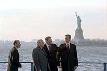 Mikhail Gorbachev with Ronald Reagan and George H.W. Bush in New York on the day of the earthquake