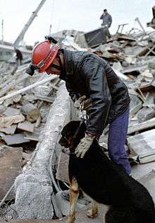 A French search and rescue worker searches for buried people with the aid of a detection dog