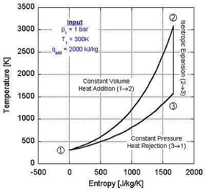 The overall efficiency of the cycle is determined by the total work over the heat input, which for a Lenoir cycle equals . Note that we gain work during the expansion process but lose some during the heat rejection process.