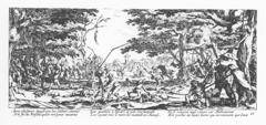 Each print has a six-line verse caption below the image, written by the famous print-collector Michel de Marolles. All show wide panoramic views, with many tiny figures, as is typical of Callot's work. The technique of using multiple bitings of acid on the plate, with different areas "stopped-out", was perfected by Callot. This method allows gradations in the strength of the line, with distant parts of the scene usually lighter.[3]