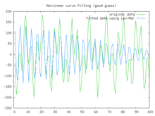 In this example we try to fit the function using the Levenberg–Marquardt algorithm implemented in GNU Octave as the leasqr function. The graphs show progressively better fitting for the parameters a = 100, b = 102 used in the initial curve. Only when the parameters in the last graph are chosen closest to the original, are the curves fitting exactly. This equation is an example of very sensitive initial conditions for the Levenberg–Marquardt algorithm. One reason for this sensitivity is the existence of multiple minima — the function has minima at parameter value and .