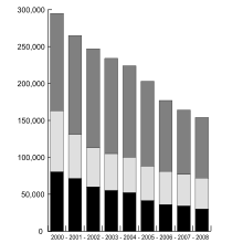 Notes: Europe figures for 2000–2003 are all Europe; from 2004 figures in black are Western Europe. For 2004–2008 figures for Asia and Africa include Eastern and Central Europe.
