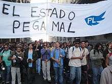 On May 2011, party members took part in the Global Marijuana March in Buenos Aires under the slogan The State is a bad trip (Spanish: El Estado pega mal).[19] The Liberal Libertarian Party support marijuana legalization claiming the State should respect individual actions as long they do not harm another individual's freedom.[7][20] The party argue that prohibition violates article 19 of the constitution[21] They also demanded dismissal of the charges against Matías Faray, who was detained for cannabis cultivation.[21][22]