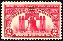 On the 150th anniversary of the Declaration of Independence in 1926 the U.S. Post Office issued a commemorative stamp depicting the Liberty Bell for the Sesquicentennial Exposition in Philadelphia in 1926,[101] though this stamp actually depicts the replica bell erected at the entrance to the exposition grounds.[102] The Liberty Bell was chosen for the stamp design theme because the symbol was most representative of the nation's independence.[103] Since then the Liberty Bell has also appeared on several other U.S. postage stamps,[104] including the first forever stamp, issued since 2007.[105]