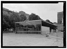 Almost from the start of its stewardship, the Park Service sought to move the bell from Independence Hall to a structure where it would be easier to care for the bell and accommodate visitors. The first such proposal was withdrawn in 1958, after considerable public protest.[69] The Park Service tried again as part of the planning for the 1976 United States Bicentennial. The Independence National Historical Park Advisory Committee proposed in 1969 that the bell be moved out of Independence Hall, as the building could not accommodate the millions expected to visit Philadelphia for the Bicentennial.[70] In 1972, the Park Service announced plans to build a large glass tower for the bell at the new visitors center at South Third Street and Chestnut Street, two blocks east of Independence Hall, at a cost of $5 million, but citizens again protested the move. Instead, in 1973, the Park Service proposed to build a smaller glass pavilion for the bell at the north end of Independence Mall, between Arch and Race Streets. Philadelphia Mayor Frank Rizzo agreed with the pavilion idea, but proposed that the pavilion be built across Chestnut Street from Independence Hall, which the state feared would destroy the view of the historic building from the mall area.[71] Rizzo's view prevailed, and the bell was moved to a glass-and-steel Liberty Bell Pavilion, about 200 yards (180 m) from its old home at Independence Hall, as the Bicentennial year began.[72]