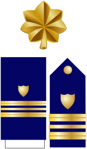 There are two insignia used by lieutenant commanders. On service khakis and all working uniforms, lieutenant commanders wear a gold oak leaf collar device, similar to the ones worn by a majors in the USAF and Army, and identical to that worn by majors in the Marine Corps. In all dress uniforms, they wear sleeve braid or shoulder boards bearing a single gold quarter-inch stripe between two gold half-inch strips (nominal size). Above or inboard of the stripes, they wear their specialty insignia (i.e., a star for officers of the line, crossed oak leaves for Civil Engineer Corps, etc.).[3]