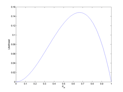 The likelihood function for estimating the probability of a coin landing heads-up without prior knowledge after observing HHT