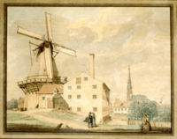 The first windmill on the site was a post mill built in 1669. It was one of numerous windmills which were constructed on Copenhagen's Bastioned Fortifications. The only other of these to survive today is the windmill at the Kastellet fortress. In the event of siege, a fortified city needed secure supplies, including supplies of flour and rolled groats. In the same time, a location on the bastions provided favourable wind conditions.[1]