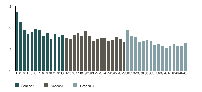 | Season 1 | 2.73 | 2.27 | 1.90 | 1.69 | 1.80 | 1.97 | 1.88 | 1.64 | 1.73 | 1.46 | 1.71 | 1.58 | 1.68 | N/A | ||
