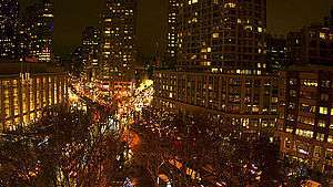 Lincoln Square is the name of both a square and the surrounding neighborhood within the Upper West Side of the New York City borough of Manhattan. Lincoln Square is centered on the intersection of Broadway and Columbus Avenue, between West 65th and West 66th streets. The neighborhood is bounded by Columbus Avenue and Amsterdam Avenue to the east and west, and West 66th and 63rd Street to the north and south.[1] However, the term can be extended to have the neighborhood between West 59th Street and West 72nd Street. It is bounded by Hell's Kitchen, Riverside South, Central Park, and the Upper West Side proper.
