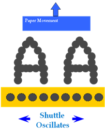 During the printing process the print-shuttle vibrates in horizontal direction with high speed while the print hammers are fired selectively. Each hammer prints a series of dots in horizontal direction for one pass of the shuttle, then paper advances at one step and the shuttle prints the following row of dots