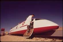 The world's first commercial automated maglev system was a low-speed maglev shuttle that ran from the airport terminal of Birmingham International Airport to the nearby Birmingham International railway station between 1984–1995.[9] The length of the track was 600 metres (2,000 ft), and trains "flew" at an altitude of 15 millimetres (0.59 in), levitated by electromagnets, and propelled with linear induction motors.[10] It was in operation for nearly eleven years, but obsolescence problems with the electronic systems made it unreliable in its later years. One of the original cars is now on display at Railworld in Peterborough, together with the RTV31 hover train vehicle.