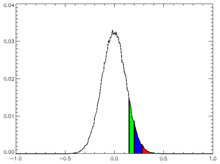 If a series which is known to be random is analysed – fair dice falls, or computer-generated pseudo-random numbers – and a trend line is fitted through the data, the chances of an exactly zero estimated trend are negligible. But the trend would be expected to be small. If an individual series of observations is generated from simulations that employ a given variance of noise that equals the observed variance of our data series of interest, and a given length (say, 100 points), a large number of such simulated series (say, 100,000 series) can be generated. These 100,000 series can then be analysed individually to calculate estimated trends in each series, and these results establish a distribution of estimated trends that are to be expected from such random data – see diagram. Such a distribution will be normal according to the central limit theorem except in pathological cases. A level of statistical certainty, S, may now be selected – 95% confidence is typical; 99% would be stricter, 90% looser – and the following question can be asked: what is the borderline trend value V that would result in S% of trends being between −V and +V?