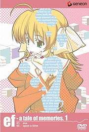 The first anime adaptation entitled Ef: A Tale of Memories. is directed by Shin Ōnuma who volunteered for the job when it was offered,[1] and is produced by the Japanese animation studio Shaft. The story follows three protagonists and their interactions with the girls they meet and gradually fall in love with. A short prologue DVD for Ef: A Tale of Memories. was released on August 24, 2007.[2] The prologue is more of a teaser which introduces the characters and some conflict that appears in the first anime series. Ef: A Tale of Memories. aired between October 7, 2007 and December 22, 2007 on the Chiba TV Japanese television network, and was later aired on subsequent networks such as, including but not limited to, TV Kanagawa, TV Saitama, and Sun TV; there are twelve episodes.[3] Each episode ends with a still image drawn by Japanese illustrators of anime, manga, and visual novels; these are listed below as endcards. The episode titles are originally written in English and as such there are no Japanese language equivalents. The first letter in each episode's title, plus the "coda" title of the last episode, can be brought together to form "Euphoric Field". The series was released in six limited and regular edition DVD compilations, each containing two episodes. The first DVD volume was released on December 7, 2007, and the sixth DVD was released on May 9, 2008.