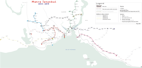 Istanbul network with lines and extensions under construction through 2019, and including proposed lines and extensions.