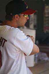 A man in a white baseball jersey, navy blue baseball cap with a red brim, and orange mirrored sunglasses stands with his arms crossed.