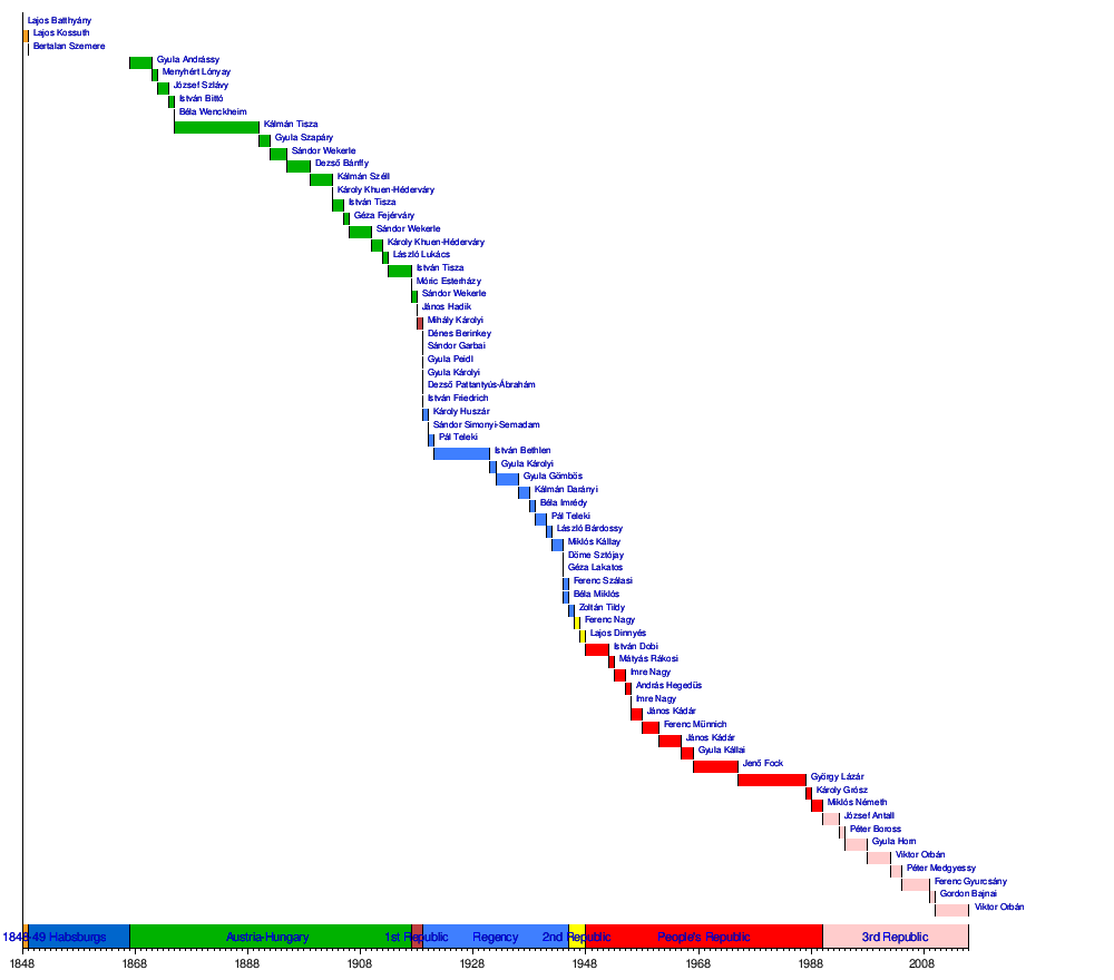 This is a graphical list of Prime Ministers of Hungary from when the first Prime Minister (in the modern sense), Lajos Batthyány, took office in 1848, until the present day.