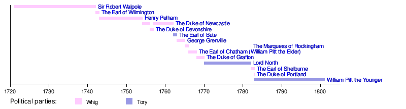This is a graphical list of Prime Ministers of the United Kingdom from when the first Prime Minister (in the modern sense), Robert Walpole, took office in 1721, until the present day.