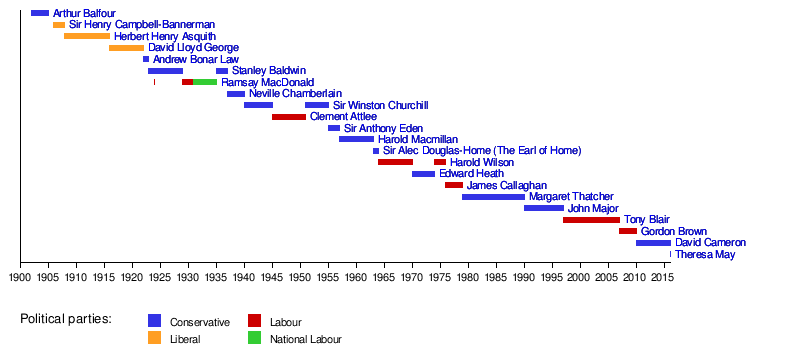 - A light colour denotes time spent in Parliament before or after serving as Prime Minister