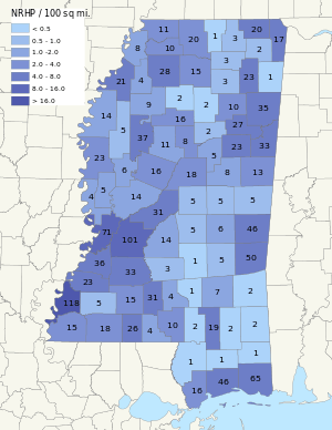 - ↑ The following sites are listed in multiple counties: Woodrow Wilson Bridge and Byram Bridge (Hinds and Rankin), Big Black River Battlefield and Big Black River Railroad Bridge (Hinds and Warren), French Site (22HO565) (Carroll and Holmes), Gatesville Bridge (Copiah and Simpson), Pharr Mounds (Itawamba and Prentiss), and Waverly Bridge (Clay and Lowndes).