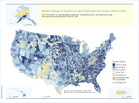 Population change in Hispanic and Latino population from 2000 to 2010. As of 2010, Hispanic and Latinos were the fastest growing population demographic in the United States
