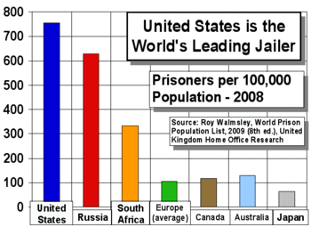 - ↑ Walmsley, Roy (30 Jan 2009). World Prison Population List (8th Edition). From World Prison Population Lists. By International Centre for Prison Studies. "The information is the latest available in early December 2008. … Most figures relate to dates between the beginning of 2006 and the end of November 2008." According to the summary on page one there were 2.29 million U.S. inmates and 9.8 million inmates worldwide. The U.S. held 23.4% of the world's inmates. The U.S. total in this report is for December 31, 2007 (see page 3), and does not include inmates in juvenile detention facilities.