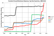 | Proven Reserves (millions of barrels) | U.S. EIA (start of 2015)[1] | OPEC (end of 2015)[2] | BP (end of 2015)[3] | Other | ||||