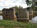 rebuilt C17; V-shaped cutwaters with refuges over; bands; chamfered ashlar coping. |