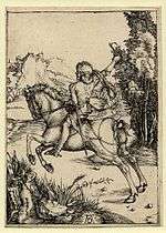 ![]() | Lady on Horseback and Lansquenet | 1496–1497 | Copper engraving | 106 × 77 mm | B82 |