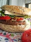 A veggie burger, garden burger, or tofu burger uses a meat analogue, a meat substitute such as tofu, textured vegetable protein, seitan (wheat gluten), Quorn, beans, grains or an assortment of vegetables, which are ground up and formed into patties. | |