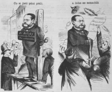 Cartoon depicting Václav Bělský (1818–1878), Mayor of Prague from 1863 until 1867, in charge of the city during Prussian occupation in July 1866. Some forces wanted to try him for high treason (left: "What some men wished" – "Dr. Bělský for high treason"), but he got a full confidence from the Council of Prague (right: "but what they did not expect" – "address of confidence from the city of Prague")