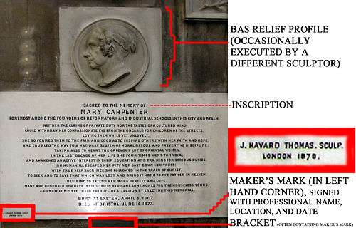 An example of a signed and dated maker's mark on a wall-mounted memorial to Mary Carpenter in Bristol Cathedral sculpted by monumental mason J. Havard Thomas of London