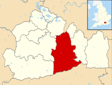 Mole Valley covers a 25,832-acre (10,454 ha) area in the centre of Surrey and had a population of 85,375 at the time of the United Kingdom Census 2011.[5] It is one of 11 local government areas in the county, which lies immediately south of London in southeast England. The main centres of population[6] are Dorking, centrally located within the district, and Leatherhead to the north, which is part of a continuous urban area incorporating Ashtead, Fetcham and Great Bookham. The M25 motorway runs through them, several railway lines provide connections in all directions, and Gatwick Airport is just beyond the southeastern boundary of the district.[7] Nevertheless, it is mostly rural—more than 90% of the land is countryside, much of which is covered by the Surrey Hills AONB—and there are dozens of small villages.[6] Most have at least one place of worship—usually an Anglican parish church, and in some cases other chapels or meeting houses serving the Protestant Nonconformist denominations which grew in importance from the 18th century. The main towns have a wider range of places of worship: Plymouth Brethren,[8] Christian Scientists,[9] the Elim Pentecostal Church[10] and Jehovah's Witnesses[11] are all represented, for example. Roman Catholics are served by large churches in Dorking and Leatherhead and smaller modern buildings in Ashtead and Fetcham.[12]