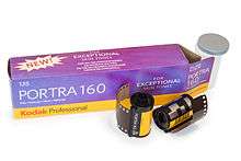 - Portra - professional color negative film designed for portraiture, with controlled colour balance, previously available at 160 and 400 ISO in "natural" and "vivid" colour varieties but replaced in 2011 with single upgraded 160 and 400 variants as well an ISO 800 Portra film. Portra films are available in 35mm, 120/220 and sheet formats. Previously a tungsten balanced ISO 100 version was sold as well.