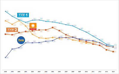 - ↑ "TVP1 i Polsat liderami rynku w 2014 roku. TVP2 ostro w dół". wirtualnemedia.pl. 5 January 2015.