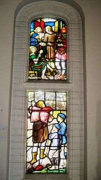 In Clapham, Greater London in 1919, Hallward executed a set of eight small windows in St Peters church's North Aisle depicting the Beatitudes,[26][27] a set of teachings by Jesus that appear in the Gospels of both Matthew and Luke. In Matthew the teachings are expressed as eight blessings in the Sermon on the Mount whilst in Luke four similar blessings appear in the Sermon on the Plain, these followed by four woes that mirror the blessings.[28]