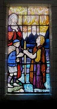 Hallward took the theme of the “Pilgrim's progress” for the windows of the Chigwell School in Chigwell, Essex[13] in 1924. He did this by depicting schoolboys as Christian's companions on his pilgrimage and contextualises Bunyan's allegory perfectly. In the left-hand window Christian starts off on his journey carrying his "burden" on his back as he walks forward, leaving the "City of Destruction" for the "Celestial City", and face the temptations ahead. Schoolboys are depicted as his fellow pilgrims.[14]