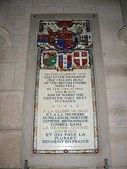 In the 1920s and 1930s the Imperial War Graves Commission (later the Commonwealth War Graves Commission) organised for memorial tablets to be erected in a number of cathedrals in France and Belgium to commemorate the British Empire's sacrifice in the 1914–18 war. The tablets, which display the Royal Coat of Arms and those of Australia, Canada, India, Newfoundland, New Zealand and South Africa, was designed by H.P. Cart de Lafontaine and made by Reginald Hallward. The tablets were located in cathedral towns in which troops had been quartered.[3]
