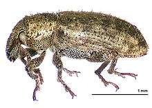 Listronotus bonariensis is a species of weevil that originated in South America and is commonly known as the Argentine stem weevil. It is a pest of grasses and cereals, with the larvae being more destructive than the adult insects. Although it is a native to South America, it has spread to Australia and New Zealand, where it is regarded as a pest species.