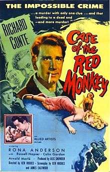 Little Red Monkey, released in the United States as Case of the Red Monkey, is a 1955 British crime film directed by Ken Hughes and starring Richard Conte, Rona Anderson and Russell Napier.[1] Detectives from Scotland Yard investigate a series of murders of leading Nuclear scientist, and are intrigued by strange reports received about the crimes. The film was based on a popular BBC TV series of the same name, written by Eric Maschwitz and produced by Bill Lyon-Shaw, which ran for six 30-minute episodes in 1953.[2]