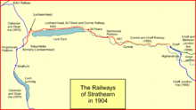 The junction station at Balquhidder was relocated about 170 yards (155 m) west of its former location; it was provided with 800 feet (244 m) long platforms. The branch faced south here; this was considered a disadvantage in the light of the intended Oban traffic. An 1897 plan prepared for the line had shown the line from St Fillans turning north and joining the Oban line nearer Killin Junction station, but this was abandoned.[1]