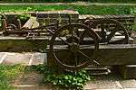 Most locks were fitted with V gates, but some locks, particularly around Seven Locks (7, 9, 10, and 12), and also all three North Branch locks (Locks 73–75 [28][29] ), were re-fitted with mechanical drop gates to speed up traffic in those areas. (Note that lock 6 had been converted to a drop gate, and later converted back to a V gate.[30]) With the mechanical locks, a lever pulls a rod which connects to a crank, connected to another rod which turned the wicket valve which was in the floor (below where the gate would rest when opened) and water flows below the floor and into the lock. Hahn states this brought the time to lock through from about 10 minutes to around 3 minutes.[20]