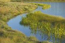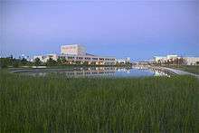 Second, 18 acres (73,000 m2) of lakes, ponds, and bayous replicate the Katy Prairie’s natural wetlands system. Underwater shelves in the larger lakes were planted with native aquatic plants, including Arrowhead and Sand Spikerush. The five buildings in the campus core front some of these lakes.