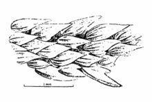 The two dorsal fins are similar in size and shape, with blunt apexes. The first dorsal fin originates over the midpoint of the pelvic fin bases, while the second originates over the midpoint of the anal fin base. The pectoral fins are large and broad, with rounded corners. The pelvic and anal fins are low and angular in shape.[2] The anal fin base is distinctively long compared to the other members of the G. arae complex, measuring 13–16% of the total length.[5] The caudal fin has a small, rounded lower lobe and a ventral notch near the tip of the upper lobe. The body is covered by small, overlapping dermal denticles, each with a leaf-shaped crown bearing a horizontal ridge and three marginal teeth. A series of enlarged denticles form an obvious saw-toothed crest along the anterior dorsal edge of the caudal fin. This species is brownish above, with a marbled pattern of darker saddles and blotches along the body and tail that become indistinct past the origin of the first dorsal fin. The underside is uniformly light, and the inside of the mouth is dark.[2][5]