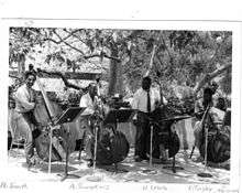 Photo, left to right, Herbert D. Smith, Andy Simpkins, Herbie Lewis, Frederick Tinsley, John Heard, Sherman Ferguson drums (hidden) and George "Red" Callender.