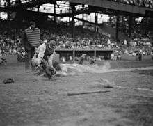 On May 2, the next game after a day off, Gehrig approached McCarthy before the game in Detroit against the Tigers and said, "I'm benching myself, Joe", telling the Yankees' skipper that he was doing so "for the good of the team."[52] McCarthy acquiesced, putting Ellsworth "Babe" Dahlgren in at first base, and also said that whenever Gehrig wanted to play again, the position was his. Gehrig, as Yankee captain, himself took the lineup card out to the shocked umpires before the game, ending the fourteen-year streak. Before the game began, the Briggs Stadium announcer told the fans, "Ladies and gentlemen, this is the first time Lou Gehrig's name will not appear on the Yankee lineup in 2,130 consecutive games." The Detroit Tigers' fans gave Gehrig a standing ovation while he sat on the bench with tears in his eyes.[47] A wire service photograph of Gehrig reclining against the dugout steps with a stoic expression appeared the next day in the nation's newspapers. He stayed with the Yankees as team captain for the rest of the season but never played in a major league game again.[47]