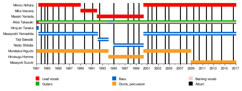 The band was started by guitarist Akira Takasaki, bassist Hiroyuki Tanaka and drummer Munetaka Higuchi, coming off the split-up of the rock band Lazy in February 1980. The three musicians, Takasaki in particular, were unsatisfied with the musical direction of their previous band and wanted to test their abilities in new areas. The rising movement of new Japanese heavy metal acts (Bow Wow, Anthem, etc.) fit the aspirations and musical tendencies of the young musicians.[4][5] Nevertheless, bassist Tanaka soon renounced to be part of the new metal group, searching success in the anime soundtrack business with the band Neverland. Takasaki recruited his childhood friend Masayoshi Yamashita as bass player[6] and, after a few auditions, the band found a singer in former Earthshaker member Minoru Niihara.